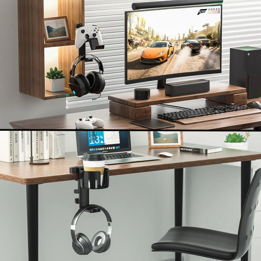 Le support pour casque et manette est l'accessoire ultime pour les gamers. Il organise à la fois votre casque et vos manettes, gardant votre espace de jeu net et prêt pour l'action.